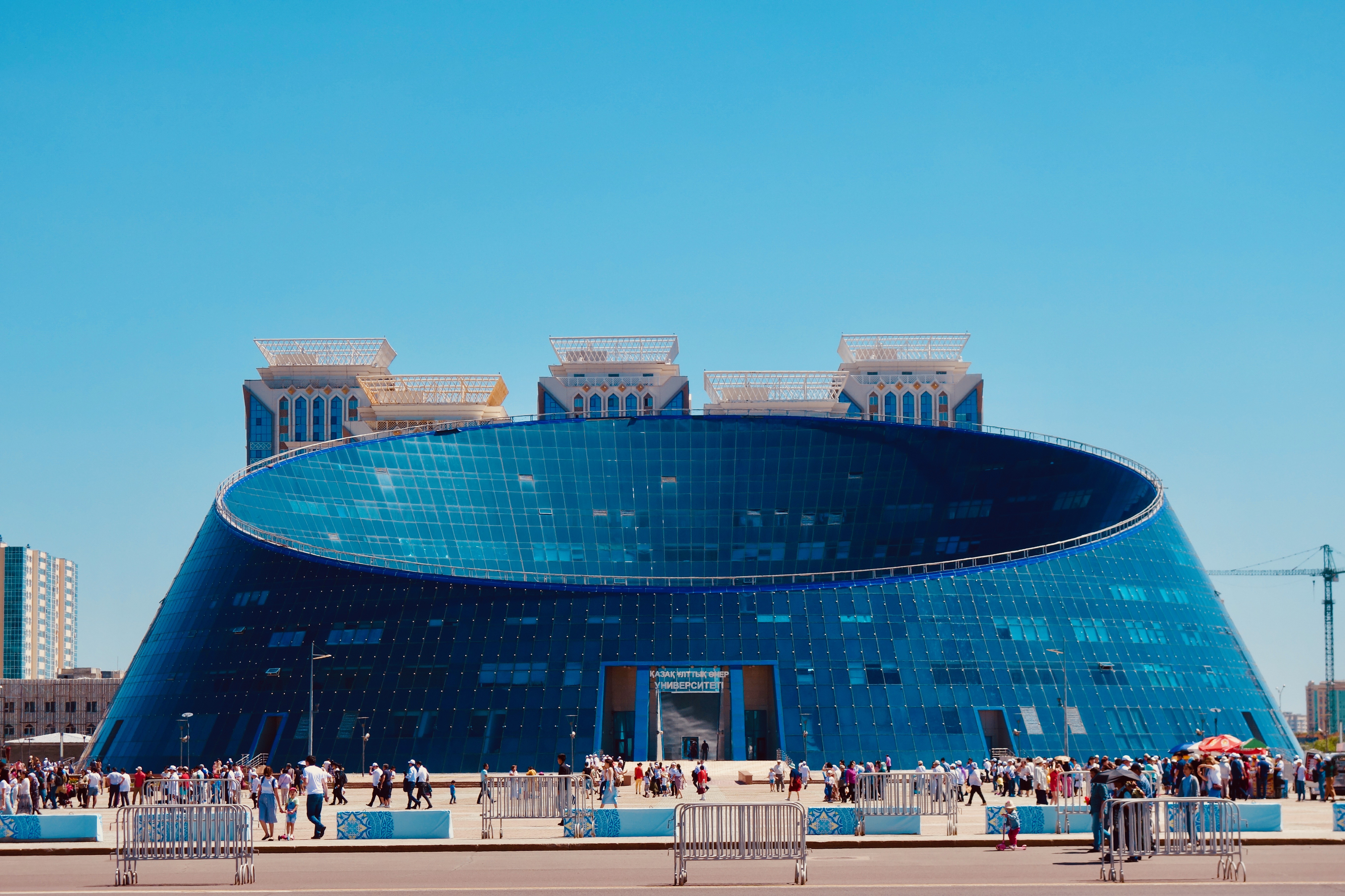 Across the street from the Palace of Peace and Reconciliation a live concert of traditional Central Asian folk music was underway in celebration of Capital City Day. Just to the right of the concert is the Astana Palace of the Arts. AKA the Dog Bowl.