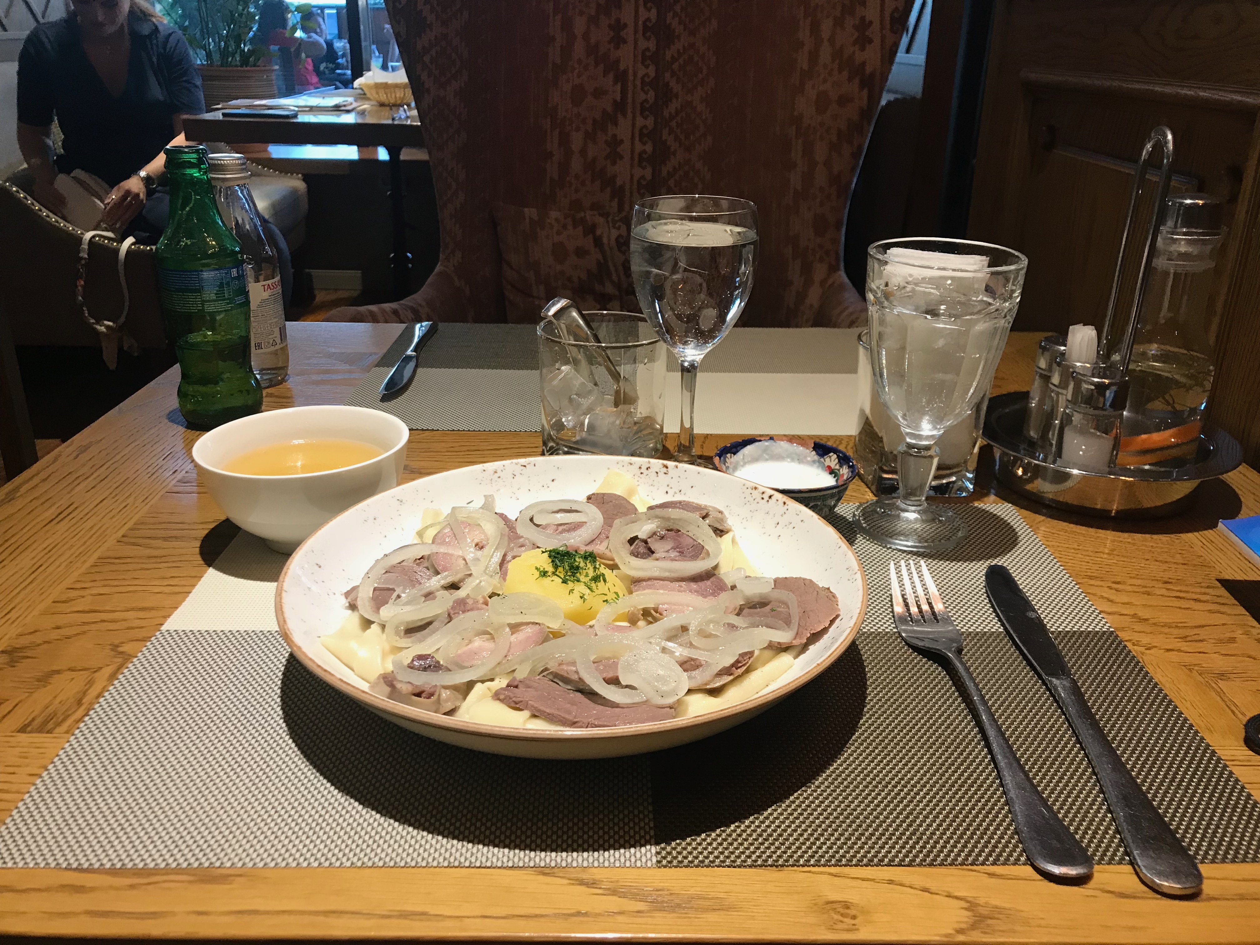 By this point it was time to get some dinner. I went to a place downtown called Saksaul, a delicious Kazakh restaurant. No trip to Kazakhstan is complete without some Beshbarmak! This is the national dish. It’s basically finely cut boiled horse meat on boiled noodles, spiced in an onion sauce. Served with mutton broth. It might sound a little weird to some of you who haven’t tried it but its actually quite good! And Saksaul really knows how to make some Beshbarmak!